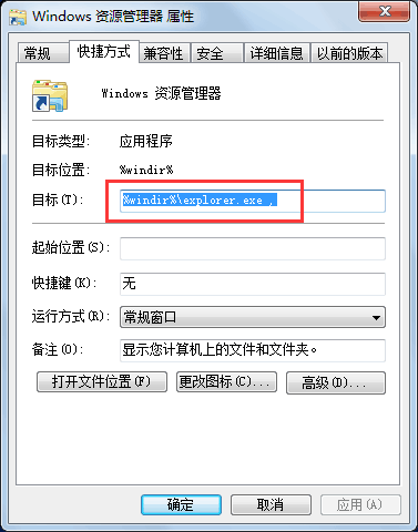 2. 在弹出对话框里将“目标”一栏的 %windir%\explorer.exe 改为 %windir%\explorer.exe ,,即加上一个空格一个逗号。