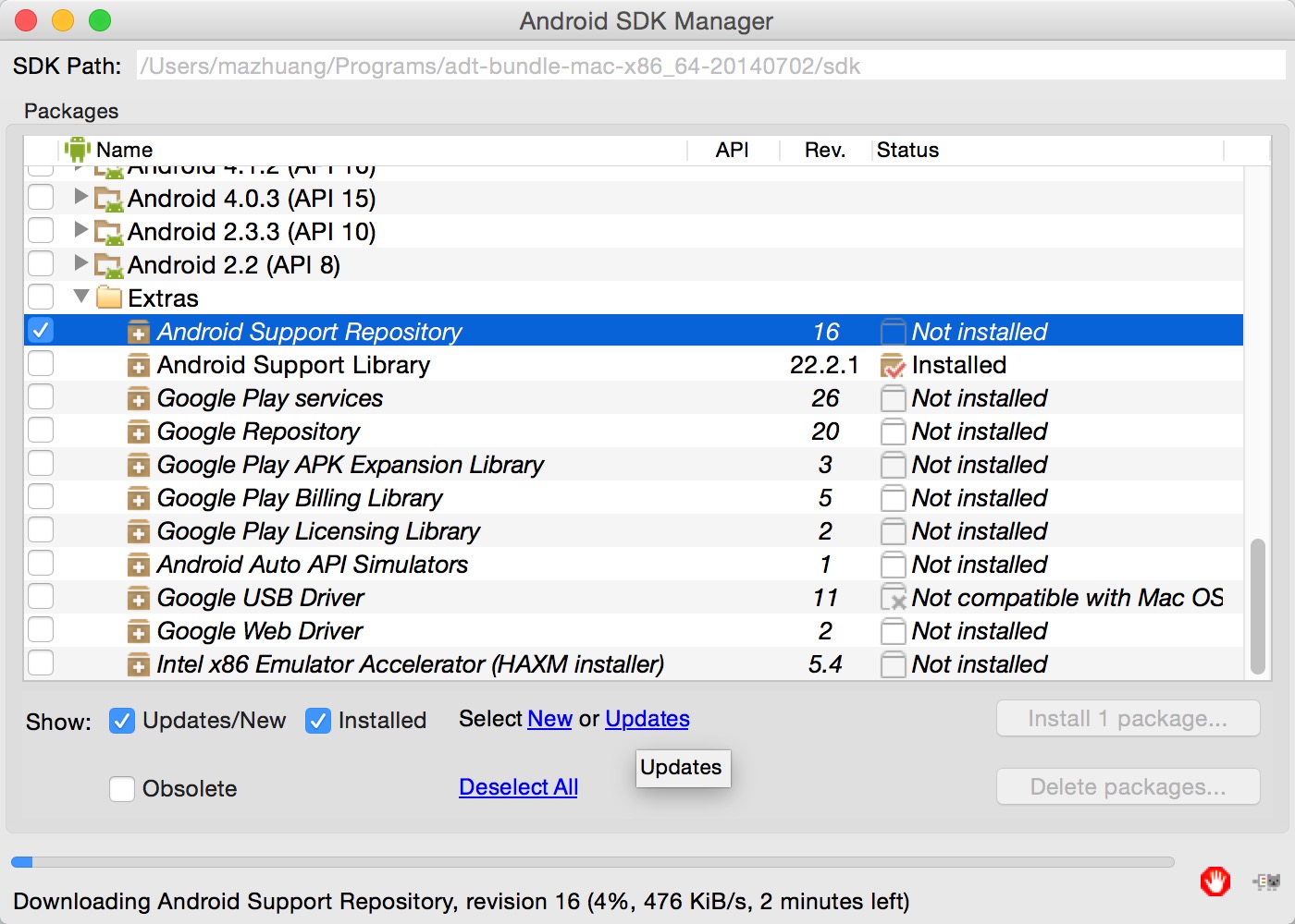 打开 SDK Manager,然后安装 Extras 下的 Android Support Repository: